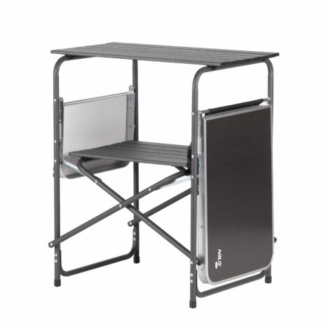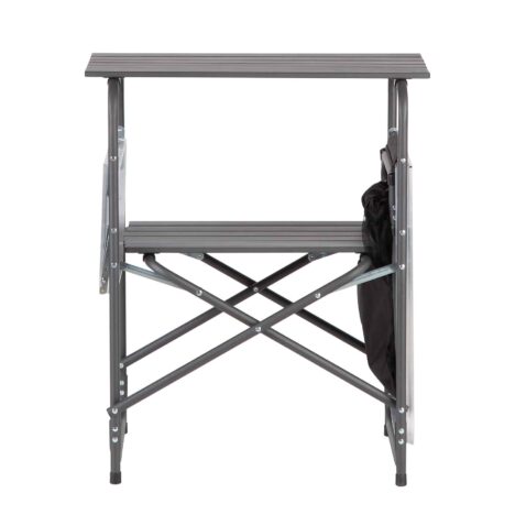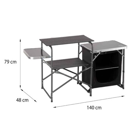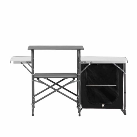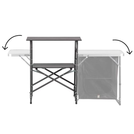 Keskelle sijoitettu vetoketjullinen kaappi tarjoaa suojaisan tilan elintarvikkeille, ruoanlaittovälineille tai muille tarvikkeille. Sivuilla on kaksi kokoontaitettavaa alumiinista lisätasoa, joiden ansiosta saat lisää työskentelytilaa ruoan esivalmisteluun tai tarjoiluun – ja kun tilaa tarvitaan, tasot taittuvat helposti alas.