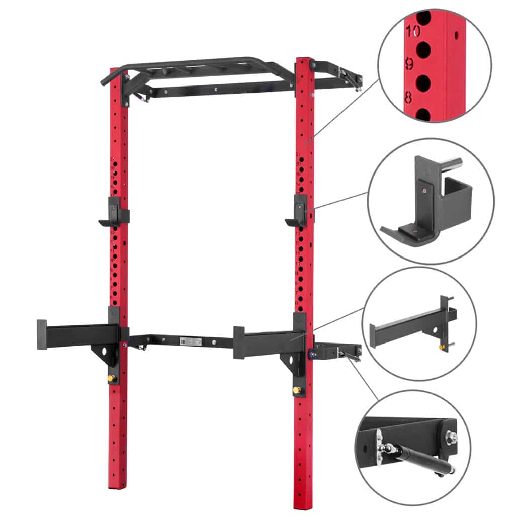 Tämä taitettava kyykkyhäkki toimitetaan kattavalla varustuksella, joka laajentaa treenimahdollisuuksia merkittävästi: