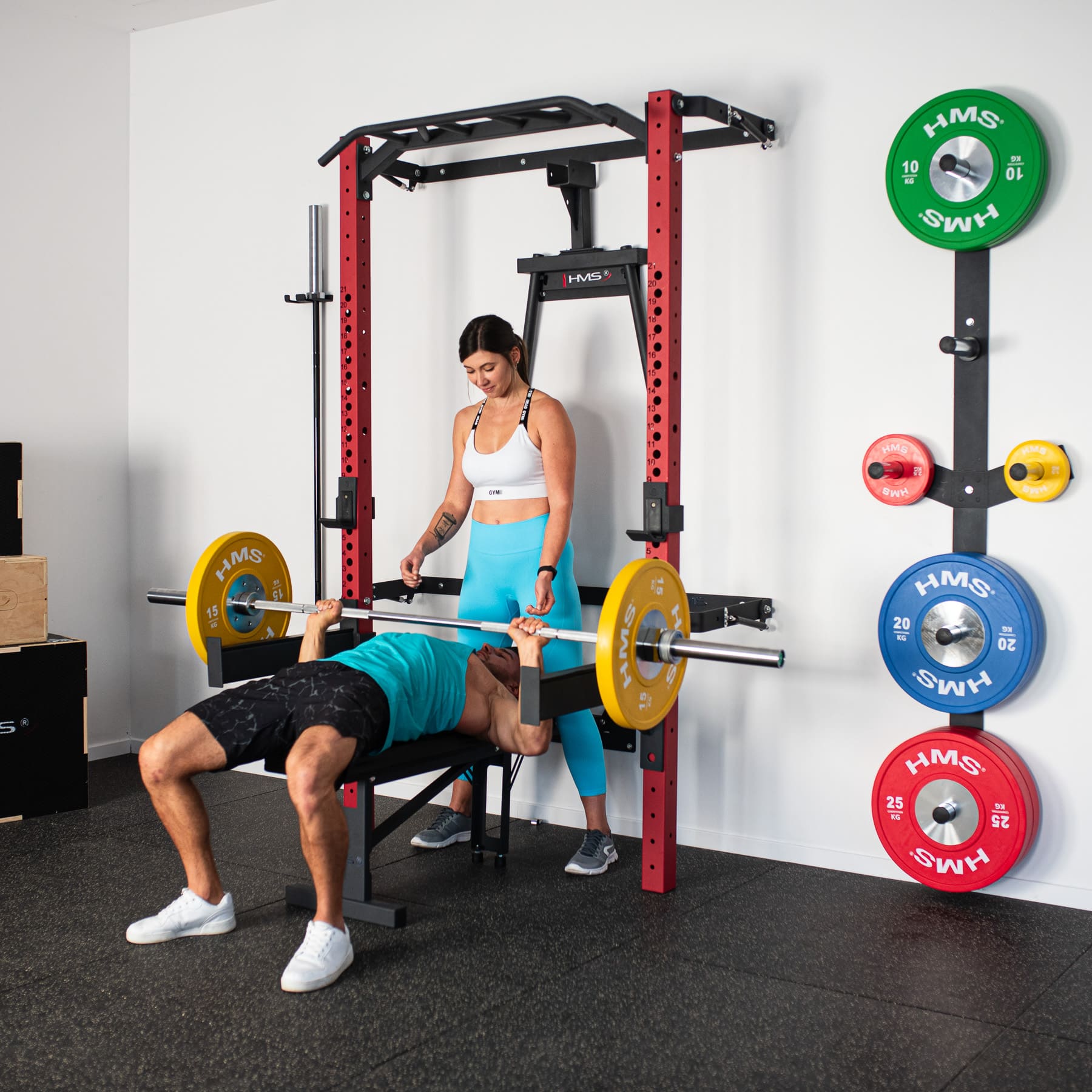 Mukana tuleva seinäkiinnitteinen levypainoteline (maksimikuorma jopa 1000 kg) sekä levytankoteline pitävät treenialueen siistinä ja turvallisena. Painot ja tangot ovat aina käden ulottuvilla mutta pois lattialta.