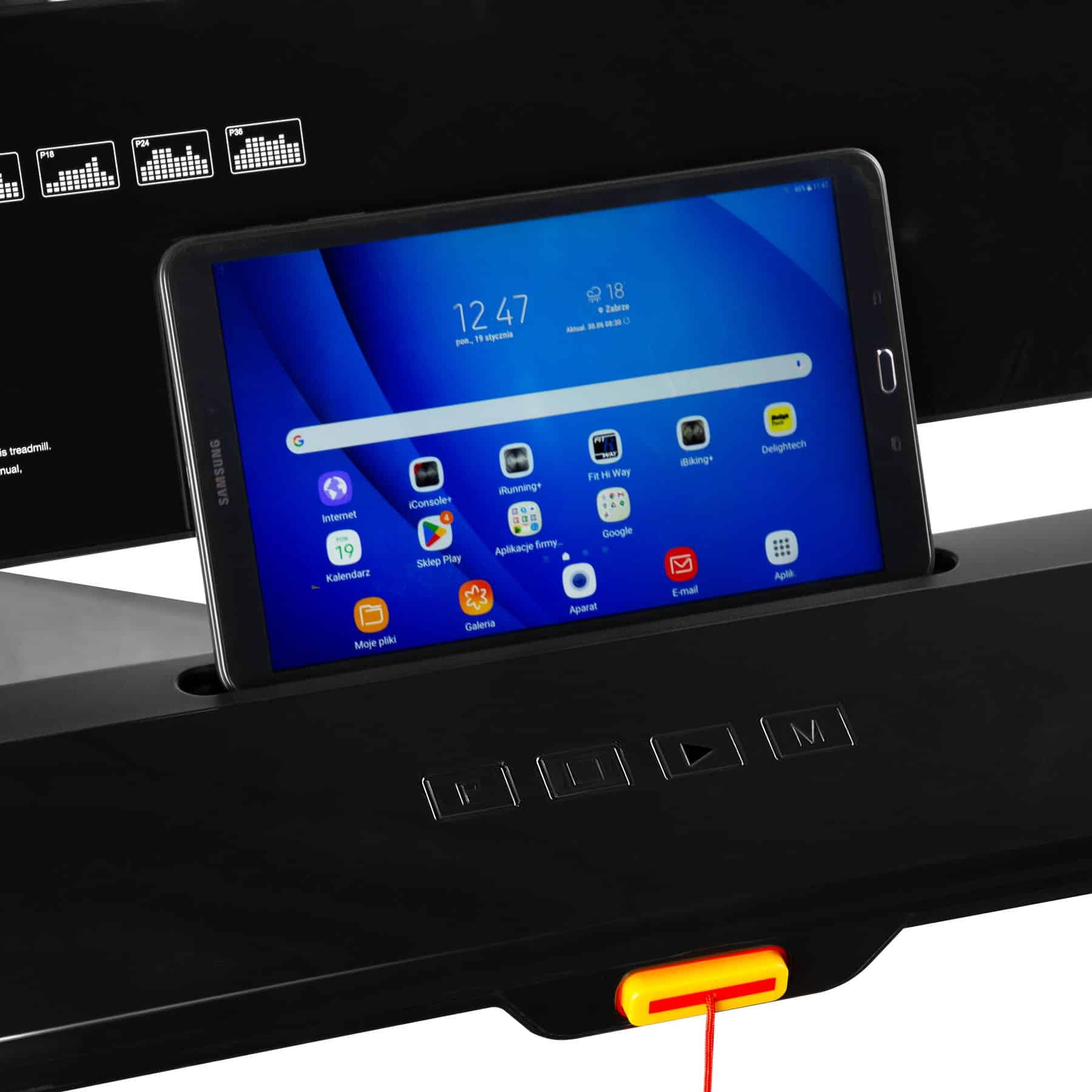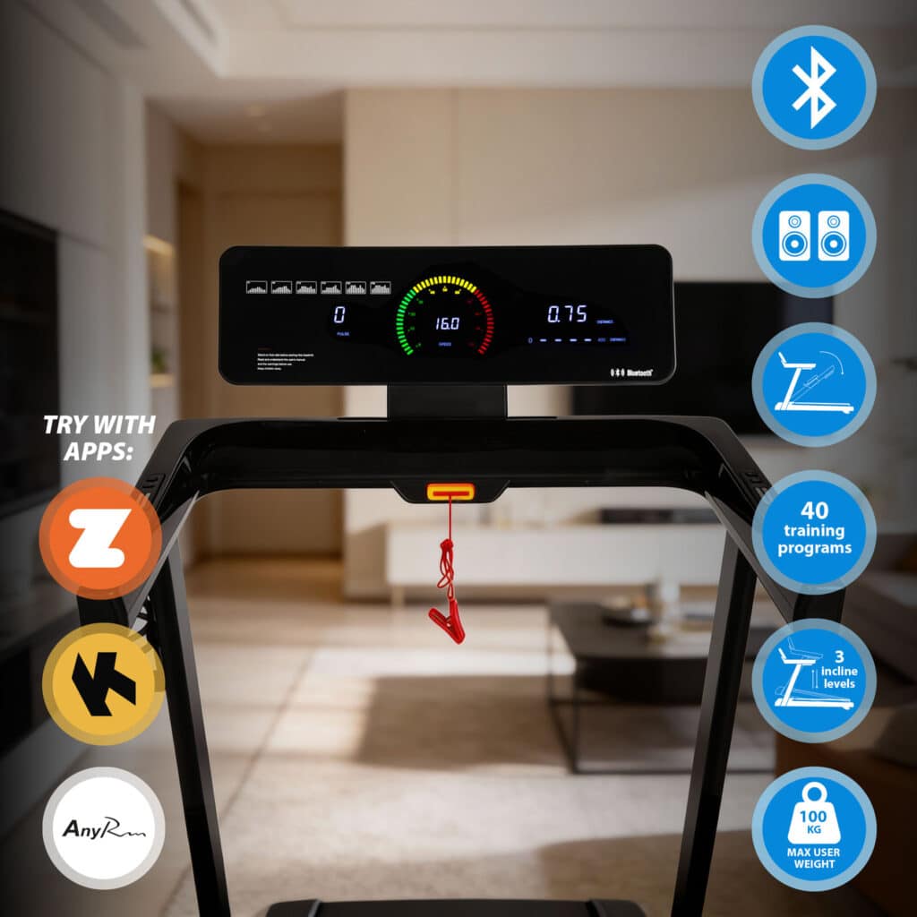 Bluetooth-yhteys ja integroidut kaiuttimet mahdollistavat musiikin ja sovellusten äänien toistamisen suoraan juoksumatolta. Tablettiteline tekee mobiililaitteiden käytöstä helppoa harjoittelun aikana.