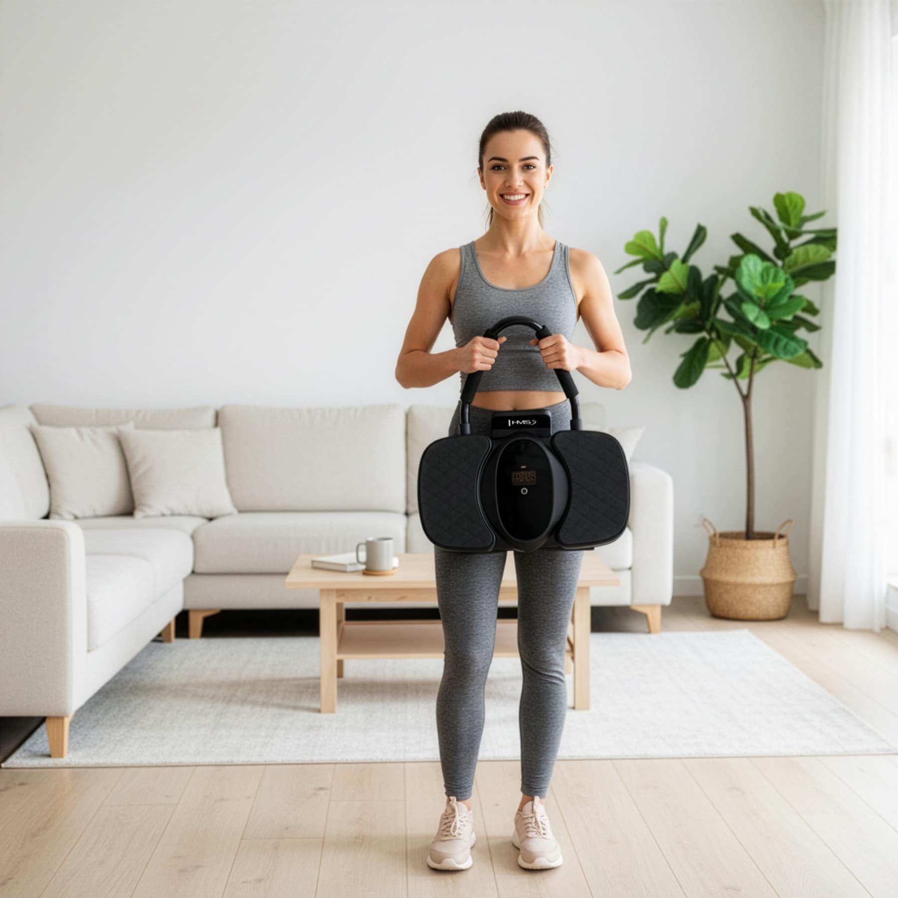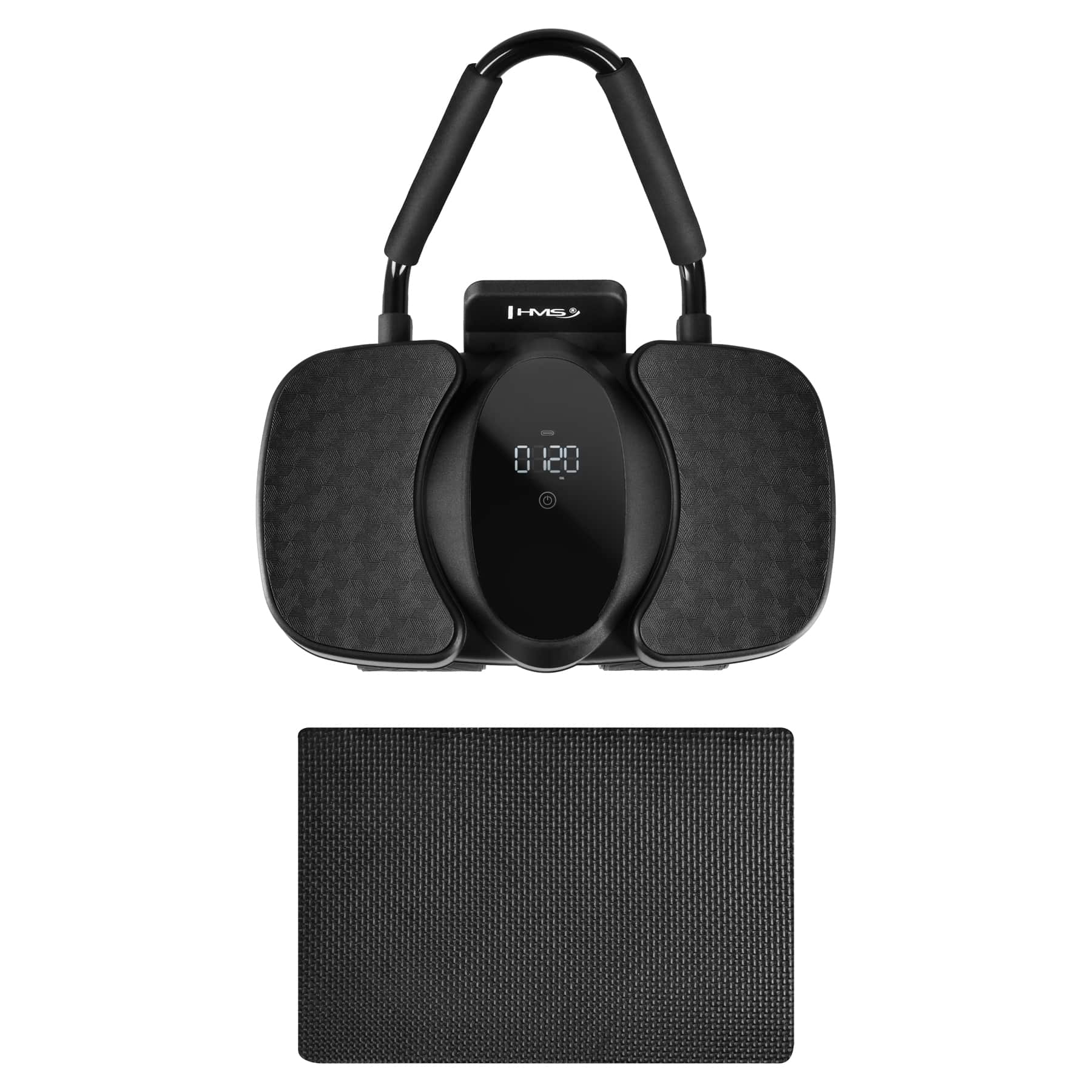 LCD-näyttö seuraa harjoittelun keskeisiä arvoja: aikaa, toistomäärää ja arvioitua kalorinkulutusta. Laite ladataan kätevästi USB-C-liitännällä, ja kokoaminen onnistuu nopeasti ilman työkaluja.