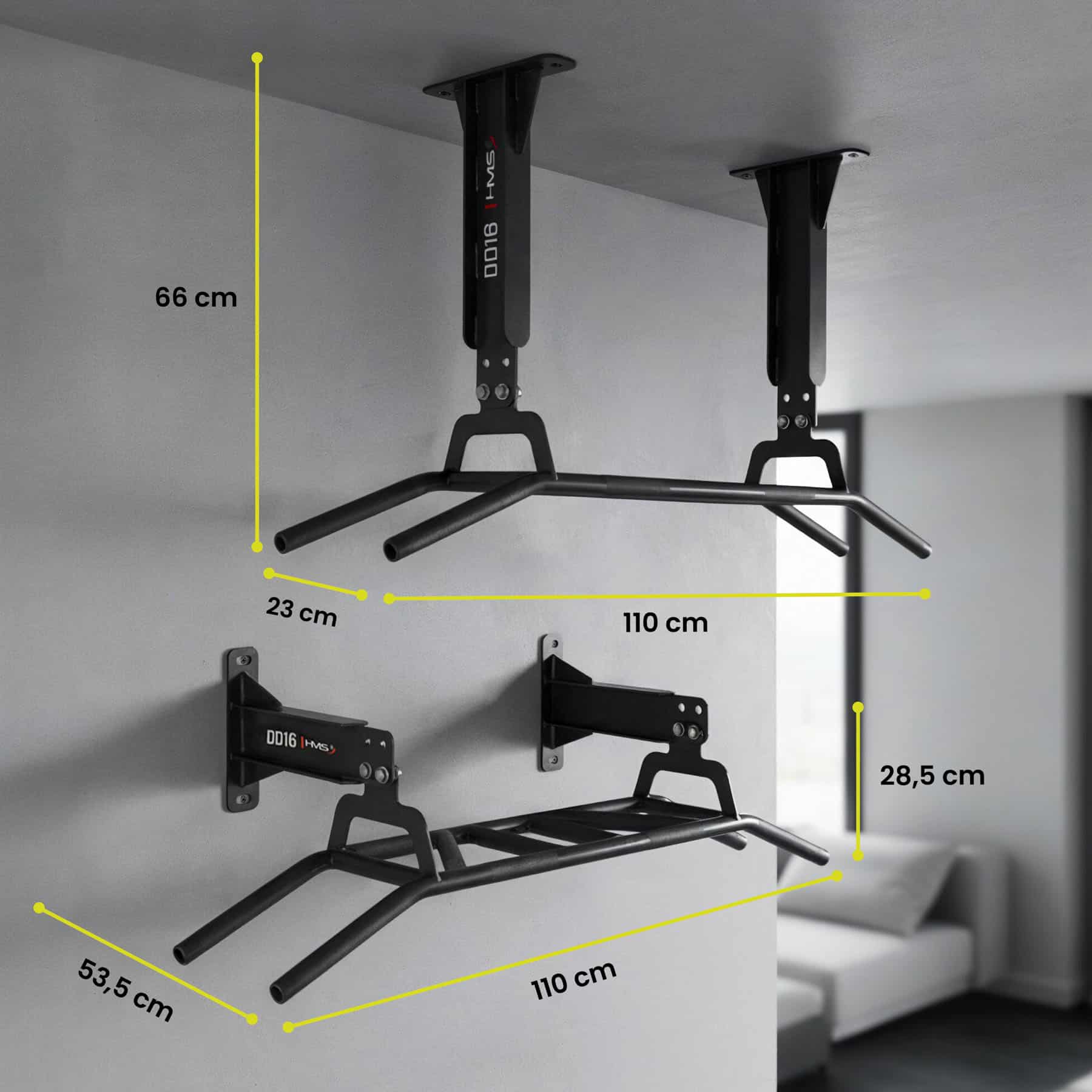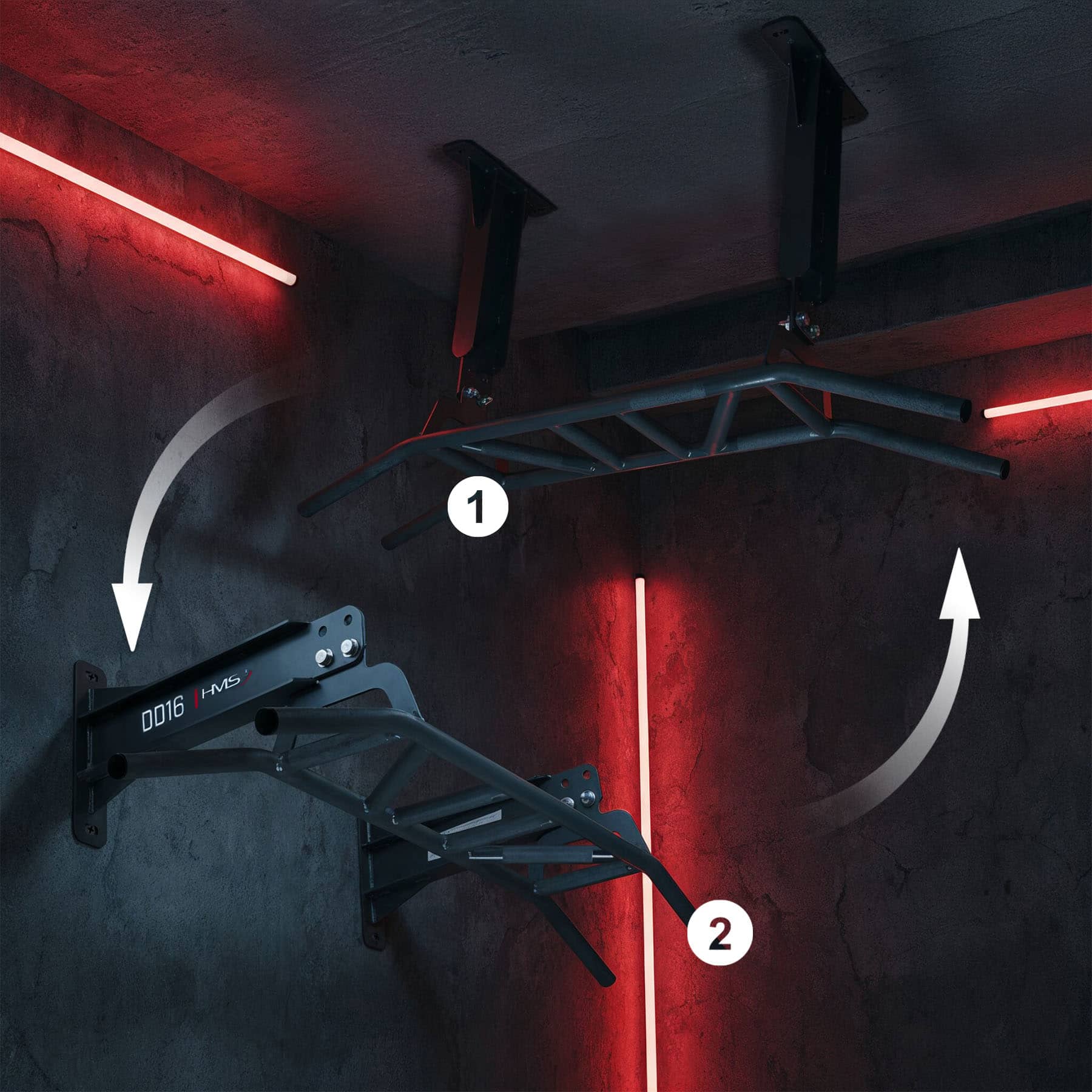 DD16 on tukeva ja monipuolinen HMS leuanvetotanko kotikuntosalille. Sen vahvuus on joustavuus: tanko voidaan asentaa joko seinään tai kattoon, jolloin treenipiste on helppo sovittaa käytettävissä olevaan tilaan ja omiin harjoitustarpeisiin.