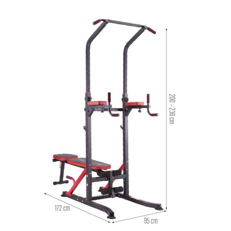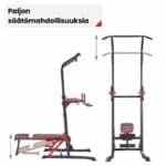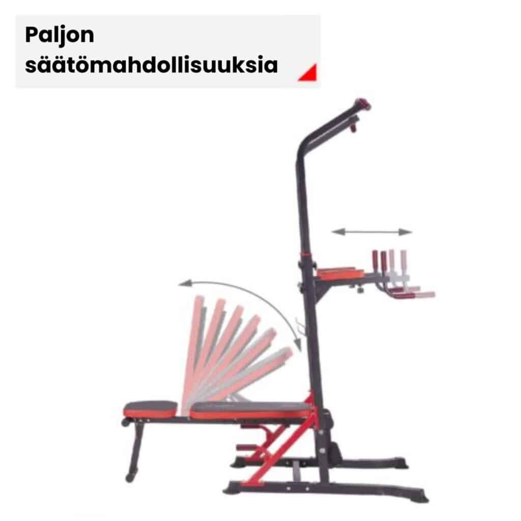 Leuanvetotangon korkeutta voidaan säätää seitsemällä tasolla, ja dippikahvojen asentoa voidaan muokata käyttäjän käsivarren mittojen mukaan. Harjoituspenkki on helposti säädettävissä vaakasuoraan, vinoksi tai pystysuoraan, mikä mahdollistaa monipuoliset lihaskuntoliikkeet kotona.