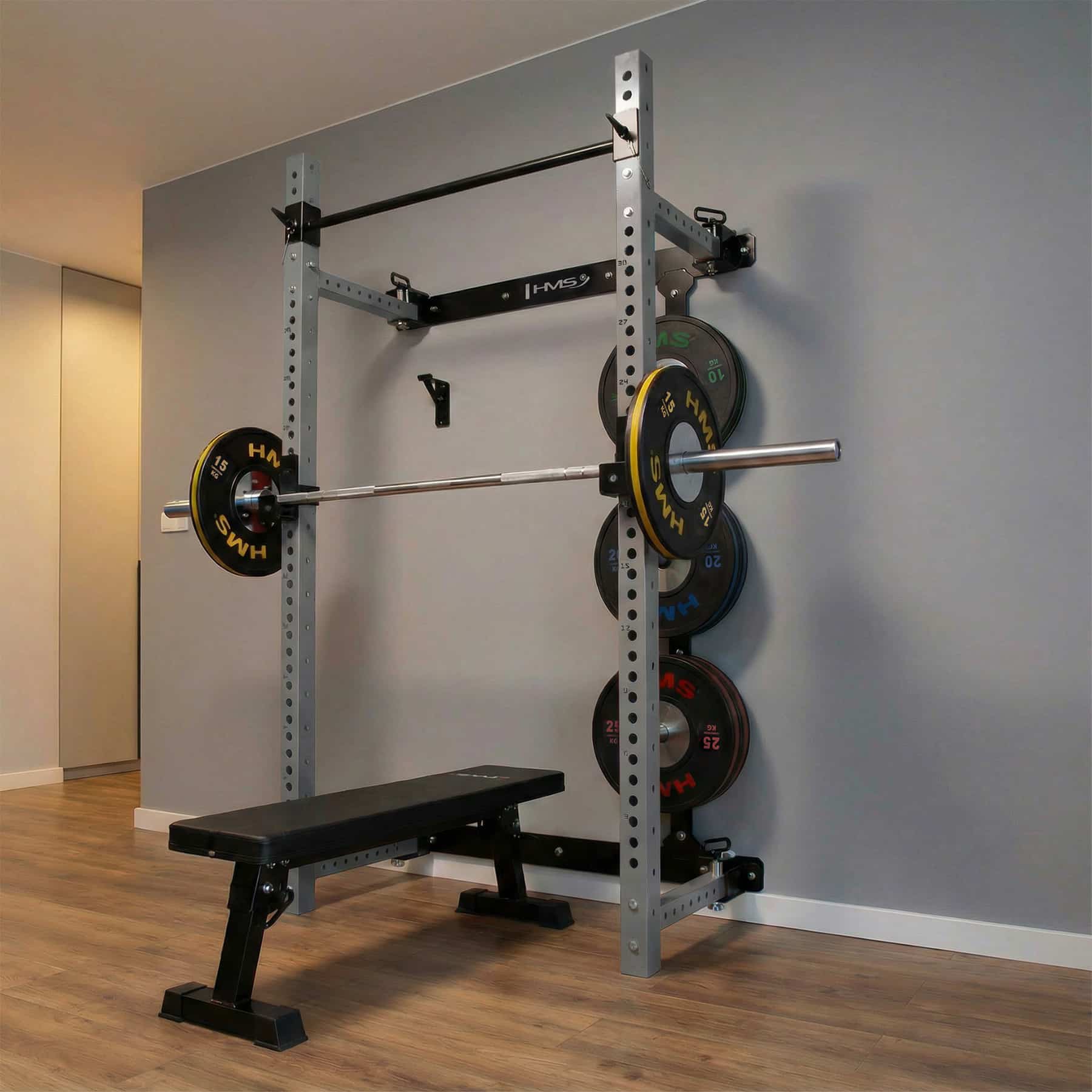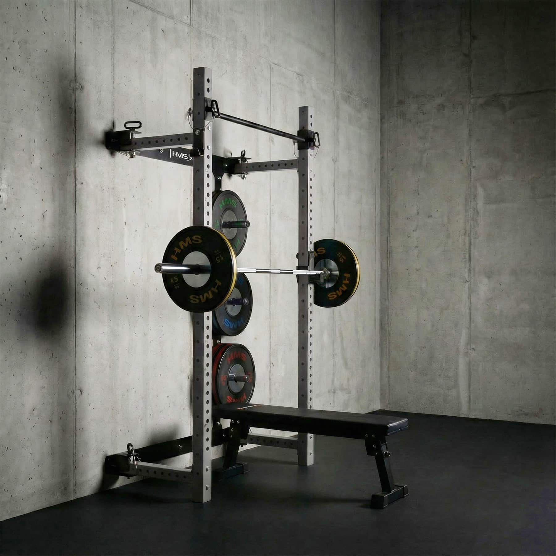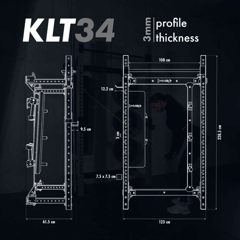 HMS KLT34 on monipuolinen ja tilaa säästävä taitettava kyykkyhäkki kotikuntosalille. Se on suunniteltu erityisesti tiloihin, joissa kattokorkeus tai lattiatila on rajallinen, mutta treeniltä vaaditaan silti täyttä toiminnallisuutta ja turvallisuutta. Sivusuuntainen liukurakenne, tukeva teräs ja toimitukseen sisältyvä taitettava penkki tekevät KLT34-mallista kokonaisvaltaisen voimaharjoitteluaseman kotiin.