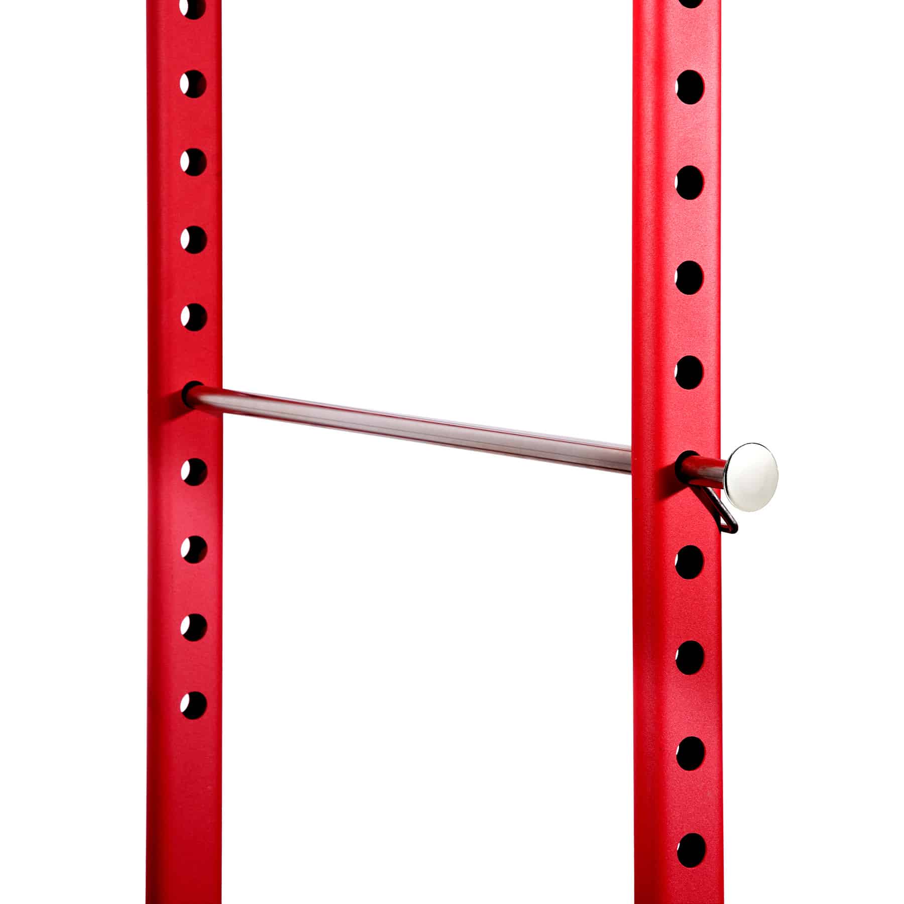 Korkeussäädettävät turvatuet ja tangonpidikkeet tekevät harjoittelusta turvallista ja mukautettavaa eripituisille käyttäjille. Turvaprofiilit kestävät jopa 200 kg kuorman, joten voit keskittyä rauhassa oikeaan suoritustekniikkaan.
