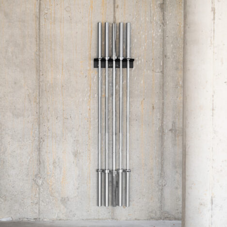 Seinätelineen vaakasuuntaiset pidikkeet nostavat tangot irti lattialta ja siirtävät ne seinälle – juuri sinne, missä ne eivät ole tiellä mutta ovat silti aina käden ulottuvilla. Tämä vapauttaa arvokasta lattiatilaa ja parantaa treeniympäristön turvallisuutta.