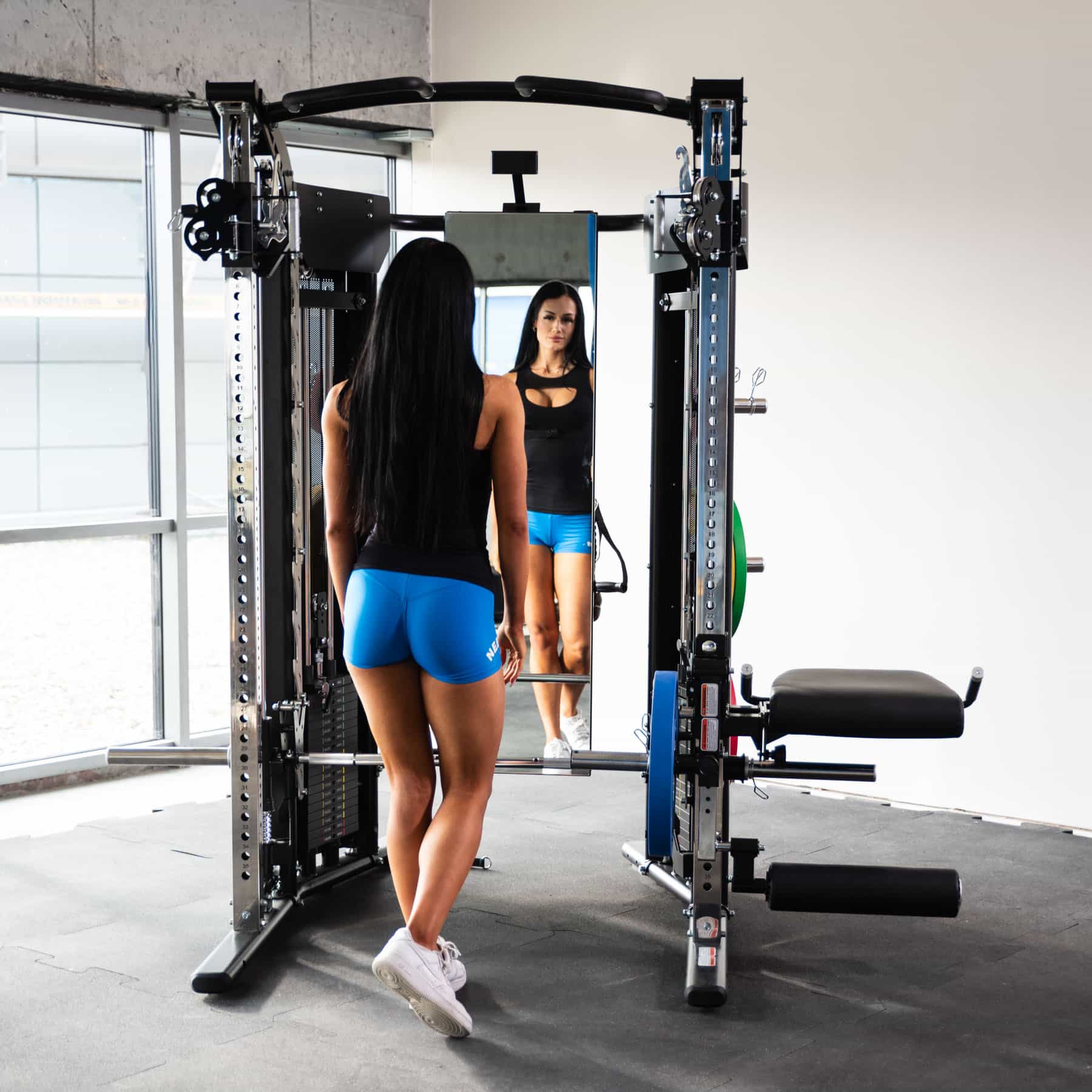 Iso peili auttaa tekniikan tarkkailussa ja tablettiteline pitää treeniohjelmat ja videot sopivalla katseluetäisyydellä. Kuusiosainen säilytysjärjestelmä ja lisäosapidikkeet pitävät treenialueen siistinä.