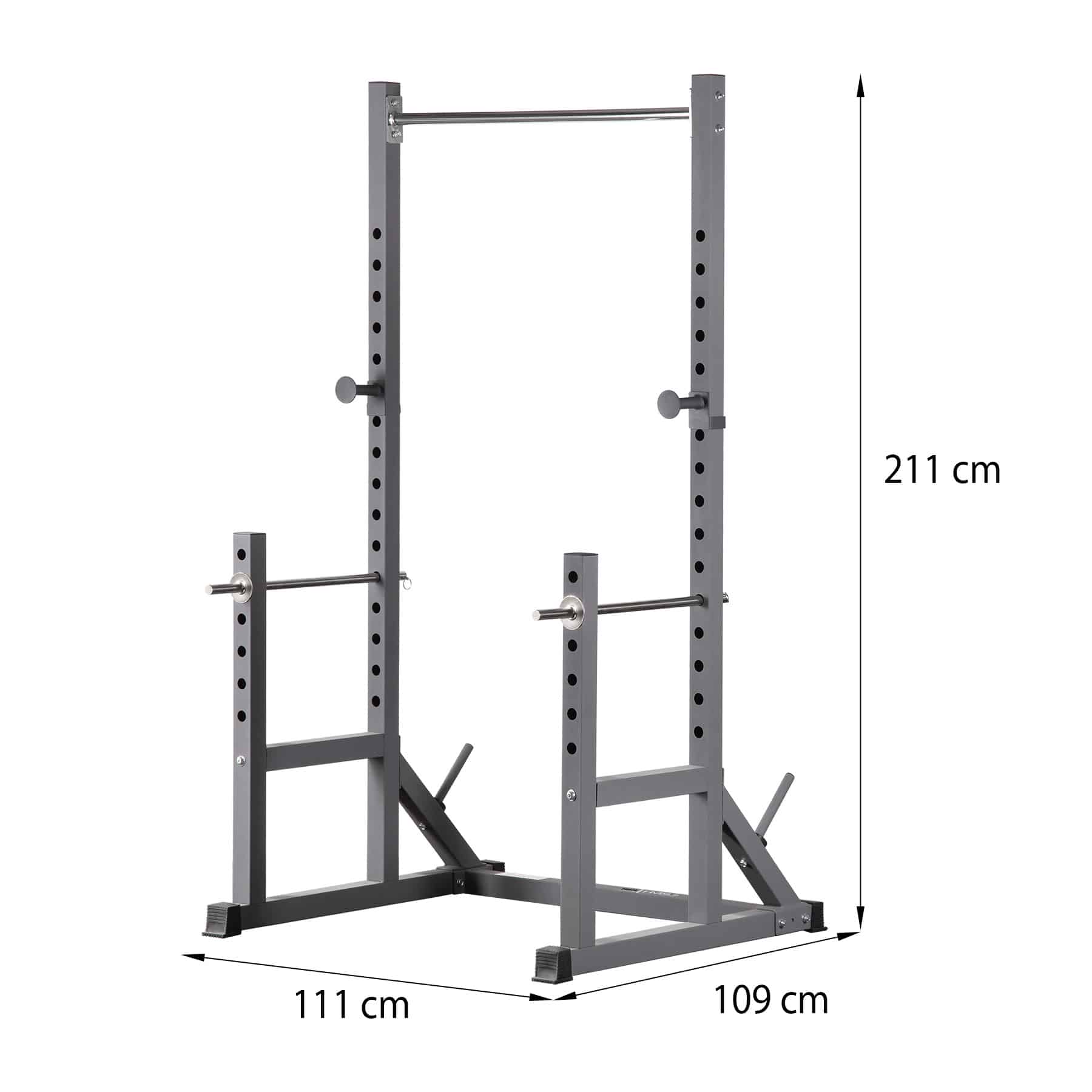 Kyykkyteline on valmistettu tukevasta teräsrungosta, joka takaa vakauden myös raskaammissa nostoissa. Turvaprofiilit suojaavat harjoittelijaa levytangon hallinnan pettäessä, ja liukumattomat jalkakumit pitävät telineen tukevasti paikoillaan koko treenin ajan.