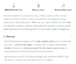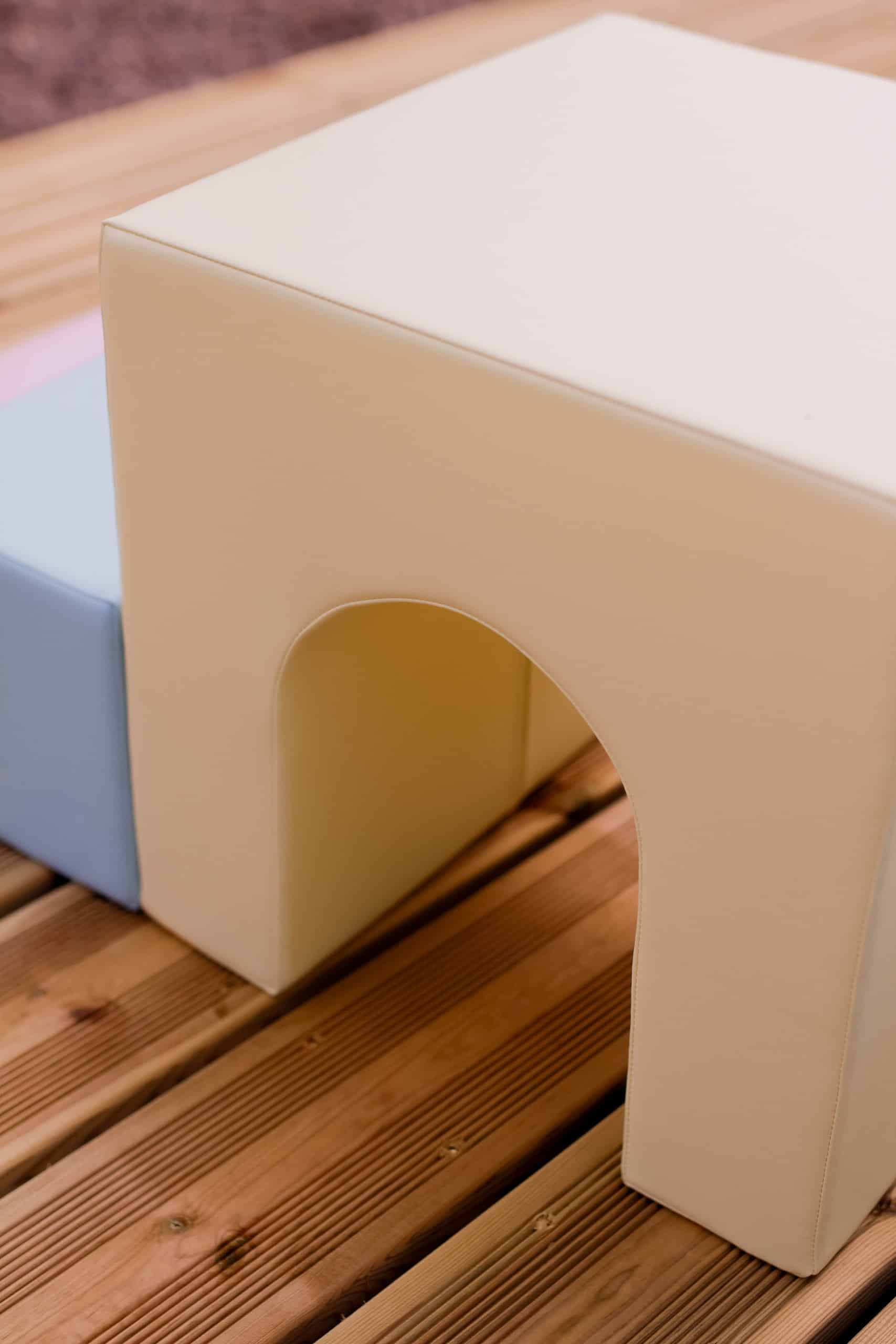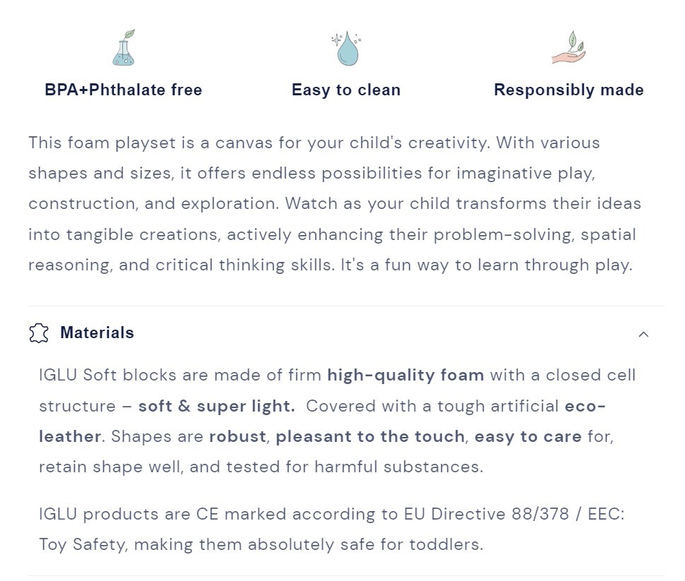 IGLUn Pehmeät palikat on valmistettu kiinteästä, 100% kierrätettävästä korkealaatuisesta vaahtomuovista, jossa on suljettu solurakenne, joten se on pehmeä & superkevyt. Ne on päällystetty kestävällä keinotekoisella eko-nahalla. Muodot ovat kestäviä, miellyttäviä koskettaa, helppohoitoisia, säilyttävät muotonsa hyvin ja ne on testattu haitallisten aineiden varalta.