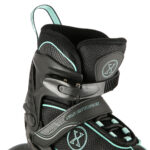 Kolmiosainen kiinnitysjärjestelmä – kaksiosainen solki, tarranauha ja nauhoitus – pitää jalan napakasti paikoillaan ja lisää turvallisuutta. Takana oleva iskunkestävä PP‑jarru auttaa pysähtymään hallitusti. Mallin tärkeä etu on sen 4‑portainen koonsäätö, jonka ansiosta yksi pari voi kasvaa käyttäjän jalan mukana jopa useamman kauden. Malli sopiikin erinomaisesti nuorille.