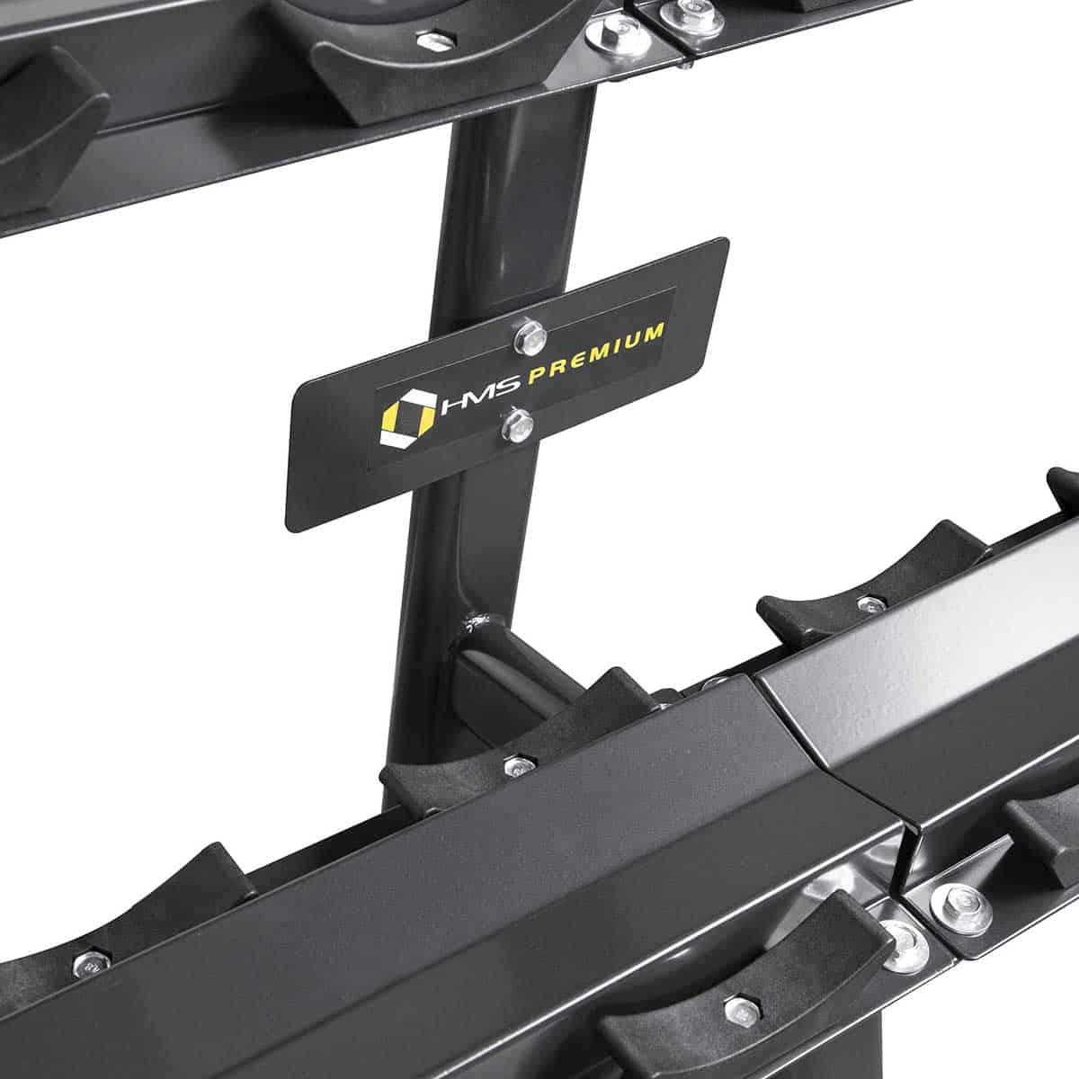 Telineen runko on valmistettu paksuseinäisestä teräksestä, ja sen huolellisesti viimeistellyt hyllytasot kestävät jopa 1000 kg kokonaiskuorman. Kahden tason rakenne säästää tilaa ja pitää painot helposti saatavilla harjoittelun aikana.