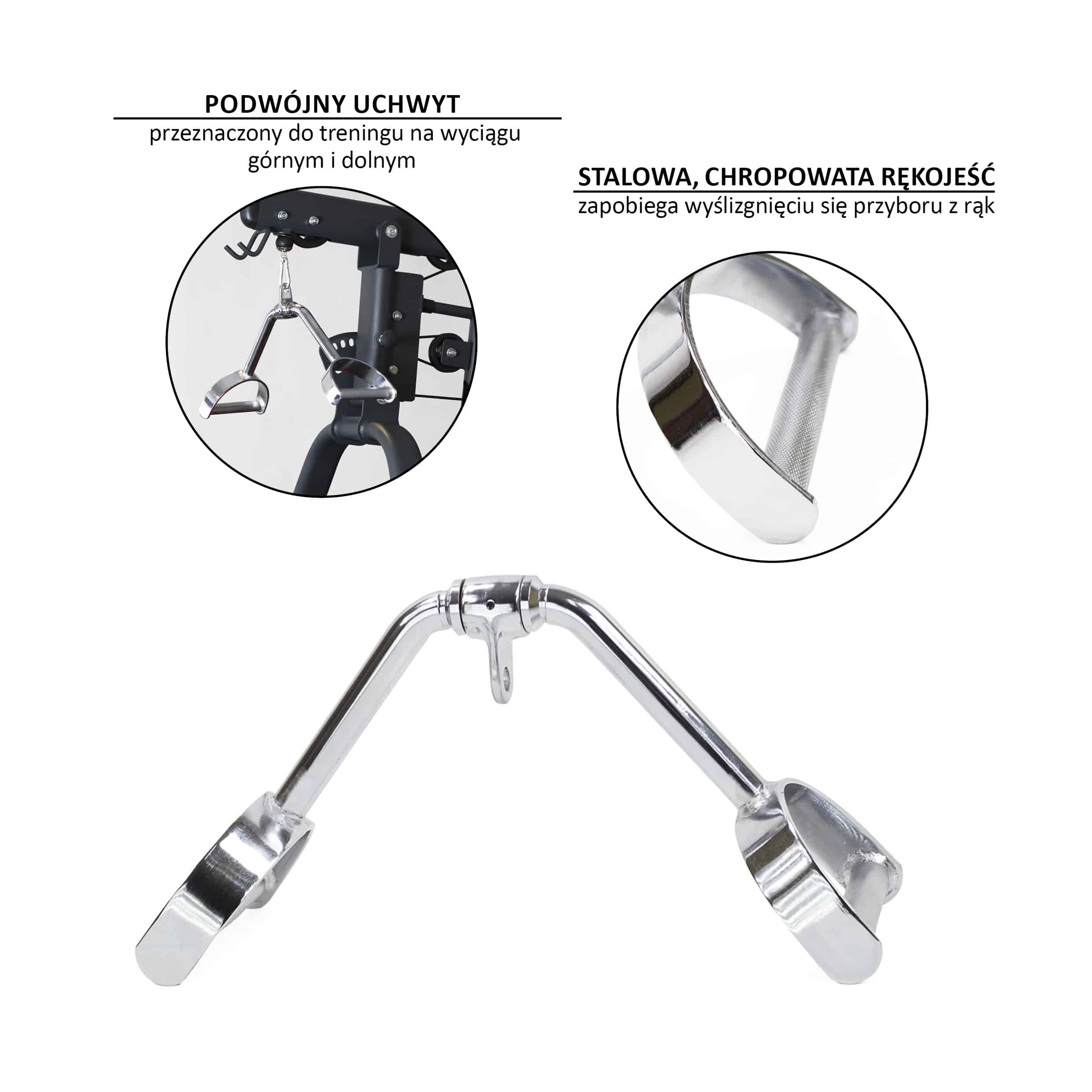 Tukeva ja leveä tuplakahva taljalaitteisiin, suunniteltu tuomaan vaihtelua ja voimaa selkätreeneihin. Leveä ote ja suuri kulma antavat liikkeille laajemman liikeradan, mikä lisää lihasjännitystä ja tekee harjoittelusta huomattavasti monipuolisempaa kuin perinteisellä kapealla kahvalla.