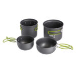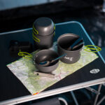 Kattilat ja kulhot on suunniteltu siten, että ne asettuvat tiiviisti sisäkkäin. Tämä säästää tilaa repussa ja tekee kuljettamisesta helpompaa. Mukana tuleva käytännöllinen säilytyspussi pitää setin siististi yhdessä ja helpottaa pakkaamista.
