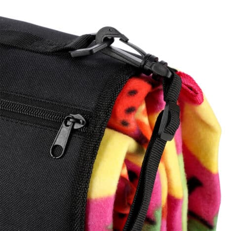 Raikas hedelmäkuosi tuo iloa ja väriä ulkohetkiin. Vetoketjullinen säilytystasku on täydellinen puhelimelle, avaimille, aurinkorasvalle tai muille pienille tarvikkeille – kaikki tärkeä pysyy käden ulottuvilla ja turvassa.