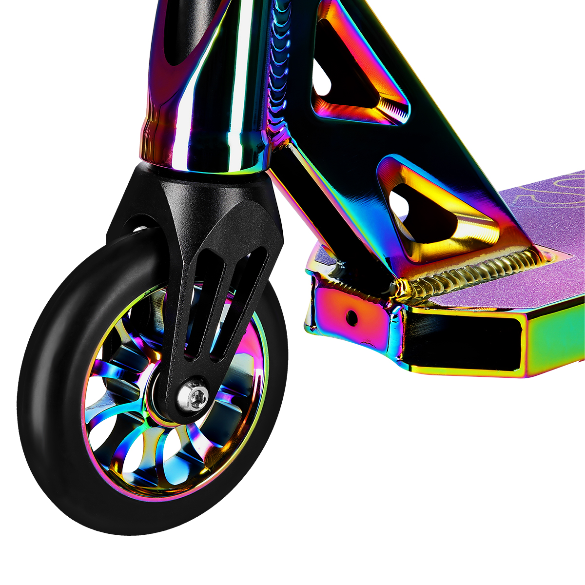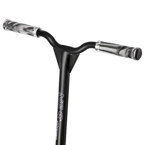 Viisikammioinen alumiininen dekki tarjoaa vakaan ja luotettavan alustan jaloille. Leveä, kierteetön ohjaustanko on vahvistettu lisähitsauksilla, mikä parantaa hallintaa ja tukevuutta vaativissa liikkeissä. Tämä rakenne mahdollistaa monipuolisen temppuilun ja sopii sekä aloittelijoille että kokeneemmille harrastajille, jotka haluavat viedä ajotekniikkaansa pidemmälle.
