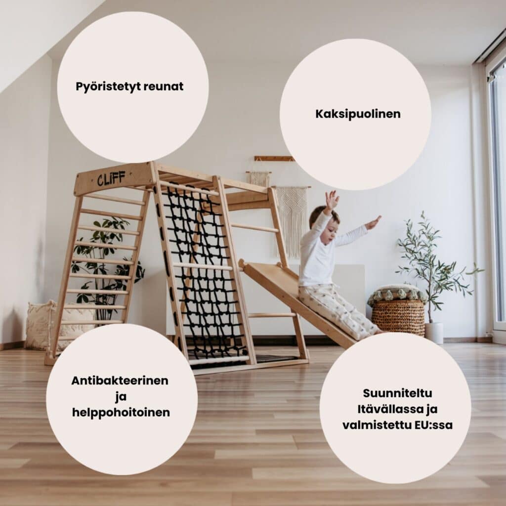 Kyllä voi. Tuote toimii hyvin myös lattialla tai matalaa alustaa vasten, esimerkiksi pienenä liukuna tai kiipeilypintana se on yhteensopiva Cliff-kiipeilytelineiden ohella myös Kidwood kiipeilytelineiden kanssa.
