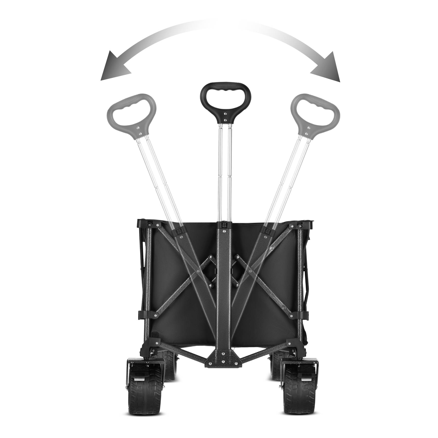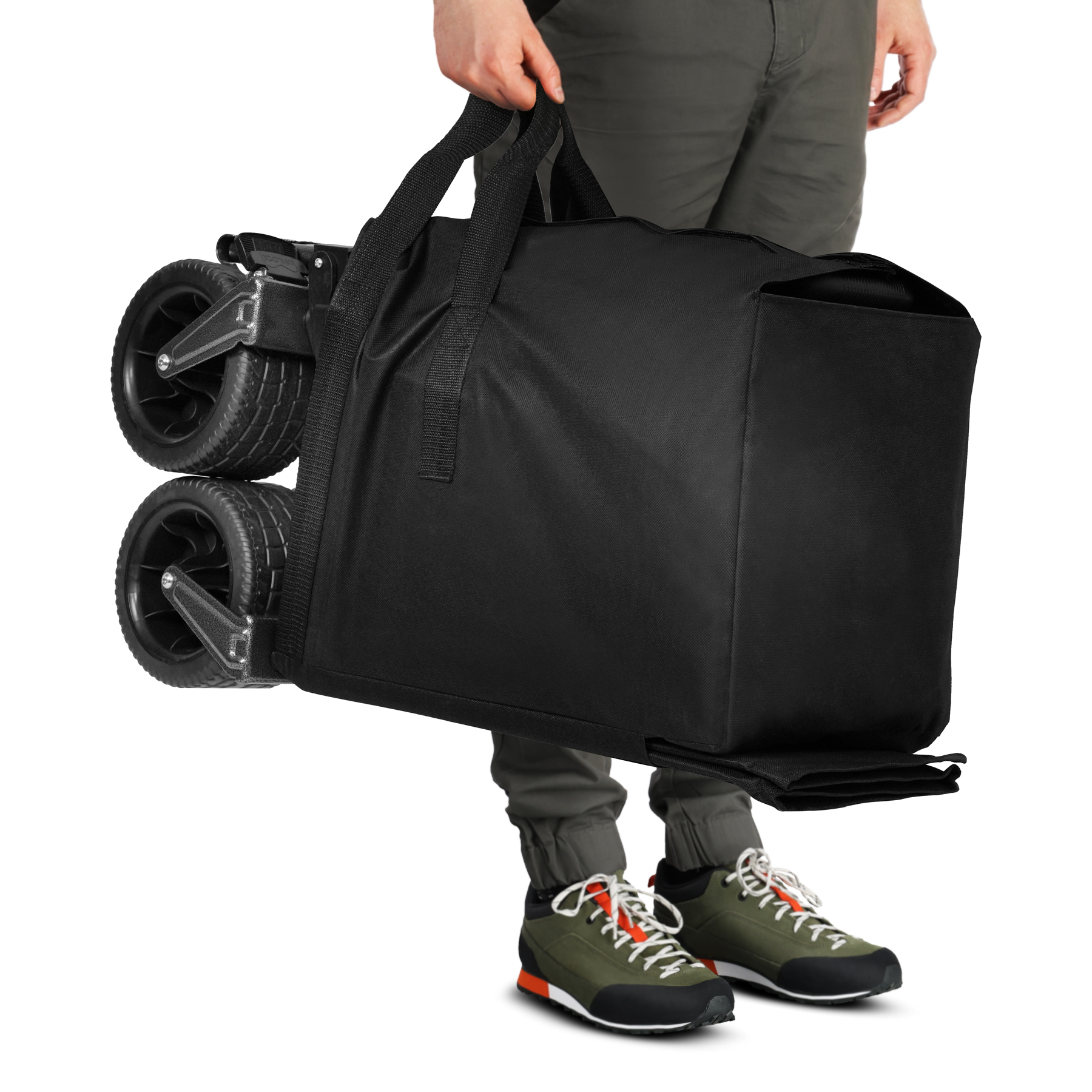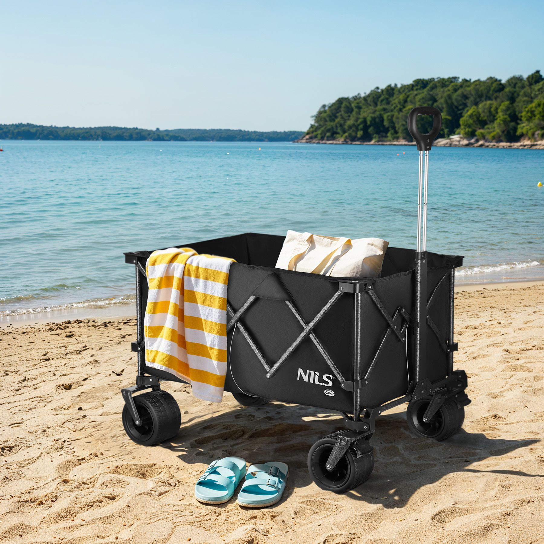Kärryn runko on valmistettu pulverimaalatusta teräksestä, joka kestää käyttöä ja vaihtelevia kelejä. Kuljetusosa on vahvaa 600D Oxford-kangasta, joka sietää hyvin kosteutta, likaa ja kulutusta. Tämä tekee kärrystä luotettavan kumppanin niin hiekkarannalle, nurmikolle kuin metsäpoluillekin.