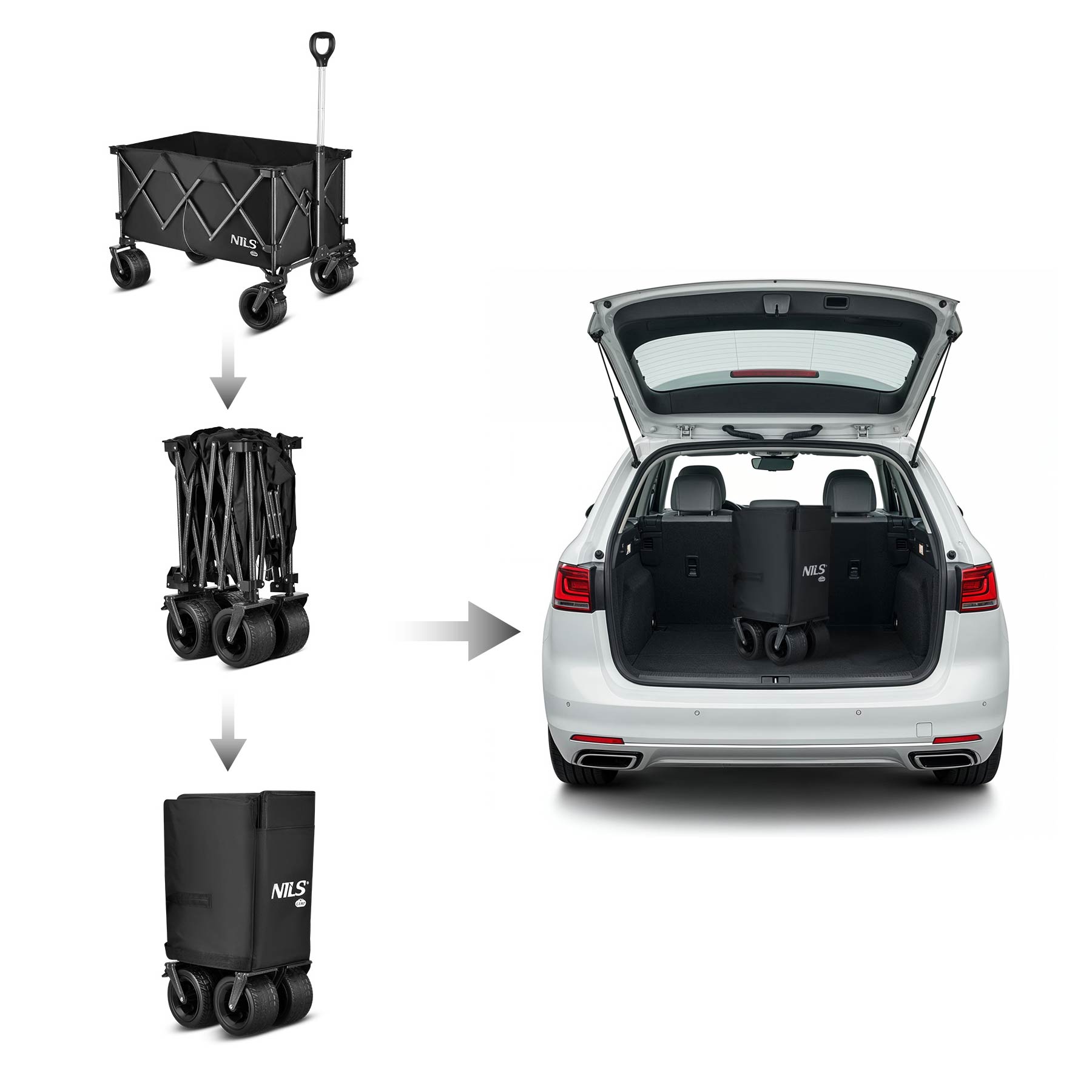 Taitettava rakenne tekee säilytyksestä ja kuljettamisesta vaivatonta – kasaan taitettuna kärry vie yllättävän vähän tilaa auton takakontissa tai varastossa.
